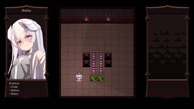 There is a plot to this game, unnecessary for a “Sokaban-style” puzzler. I thought the story on its Nintendo page sounded amateur, and in-game, it’s only marginally better. My advice would be just to ignore it, except that elements of it are hard to overlook. Screen real estate is wasted with character portraits (Shirley and Ella) on either side of the playfield. This is not a visual novel! But it does seem to want to be a blend of adventure, dungeon crawler, and RPG with puzzle wrappings. Your aim is to remove enemies from each room, but in such a pattern to ensure that Shirley and/or Ella remain with one heart left. It might sound confusing (and it kind of is), but with a controller in hand, you’ll eventually come to grips with it.